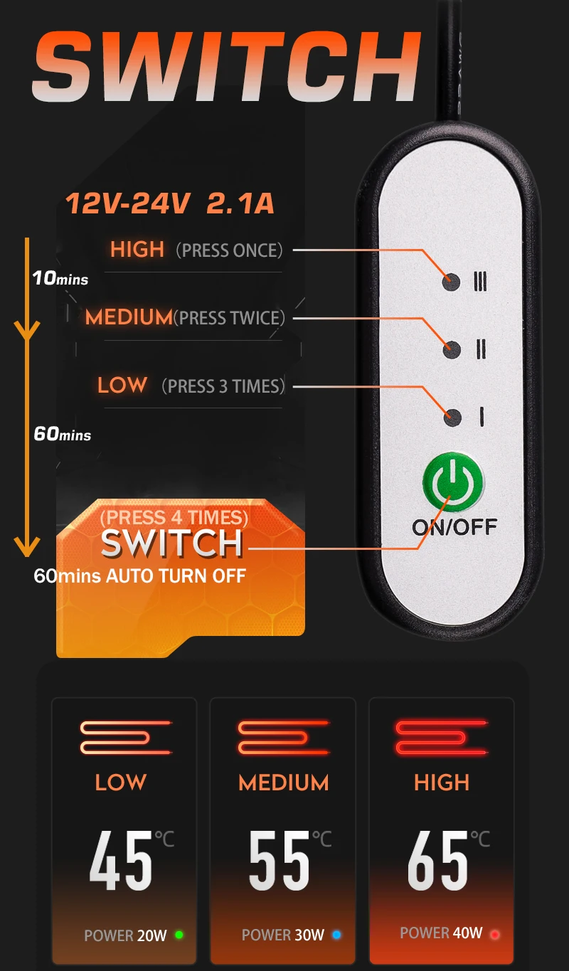 The heated seat cover offers an adjustable temperature feature. Simply click the button to adjust the temperature "High" "Mid" "Low" according to the interior temperature.